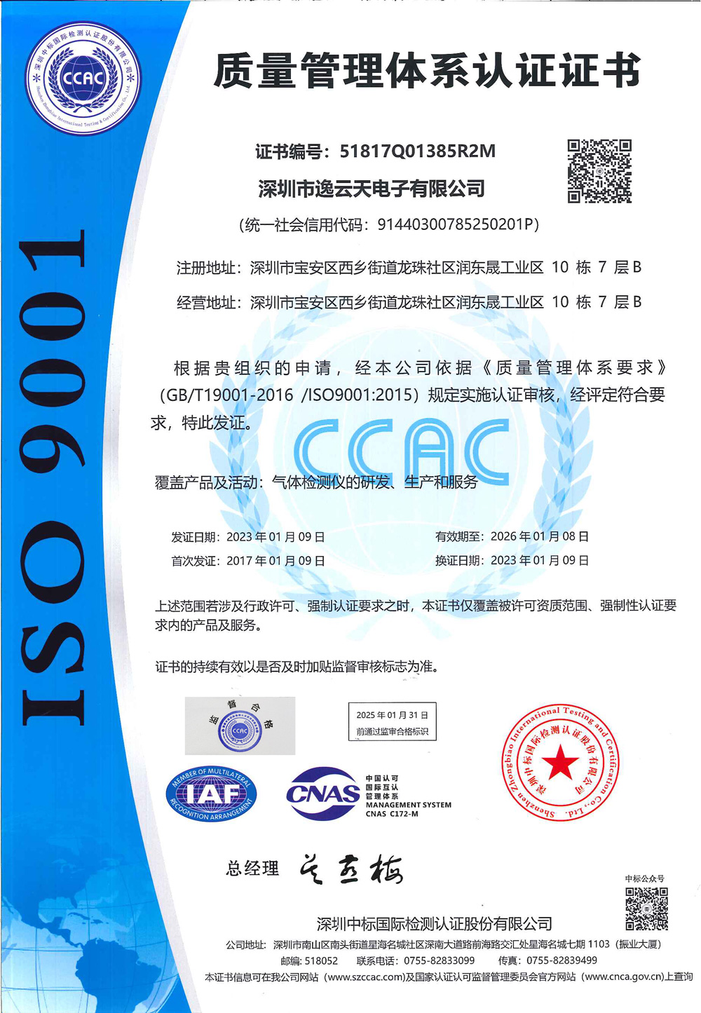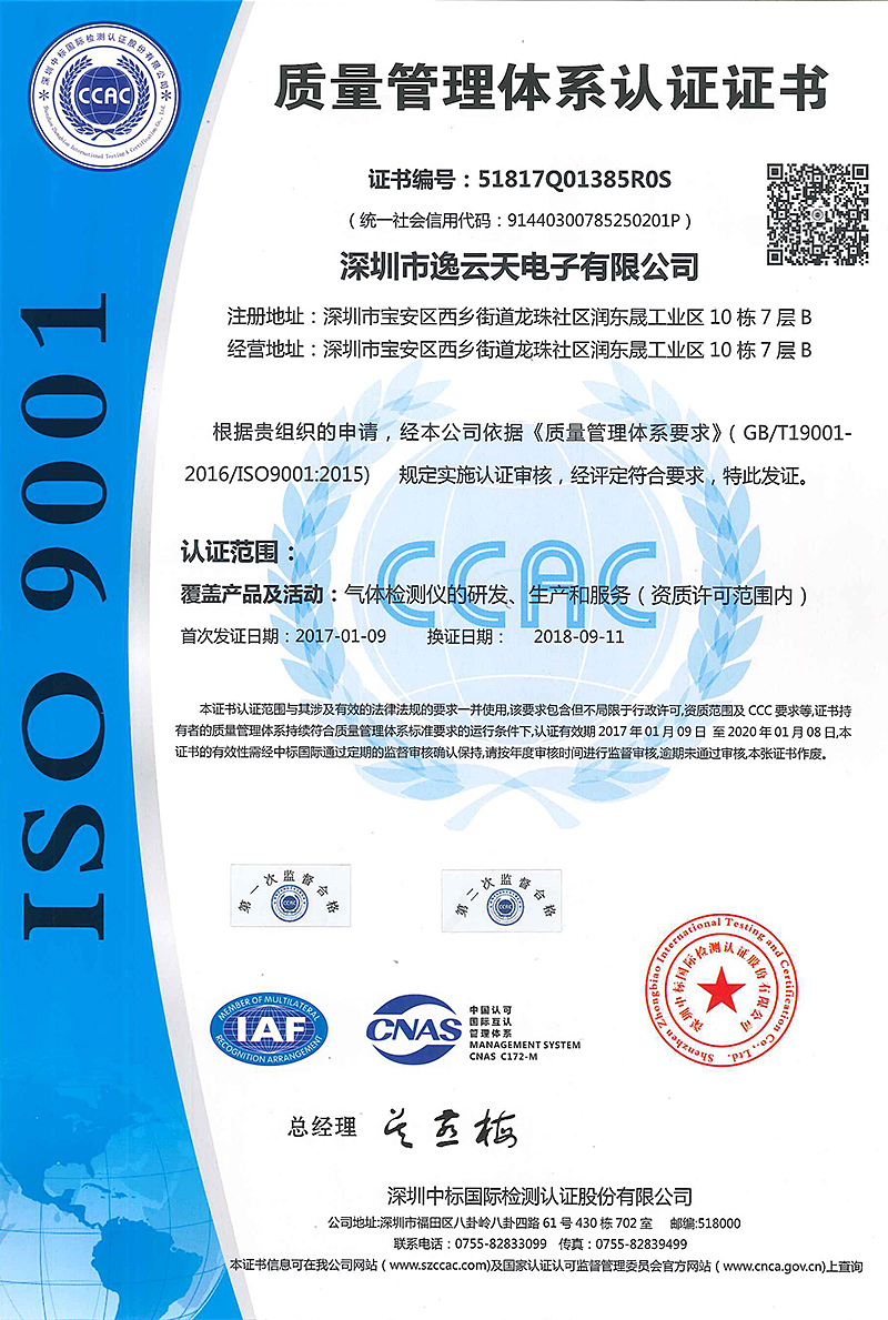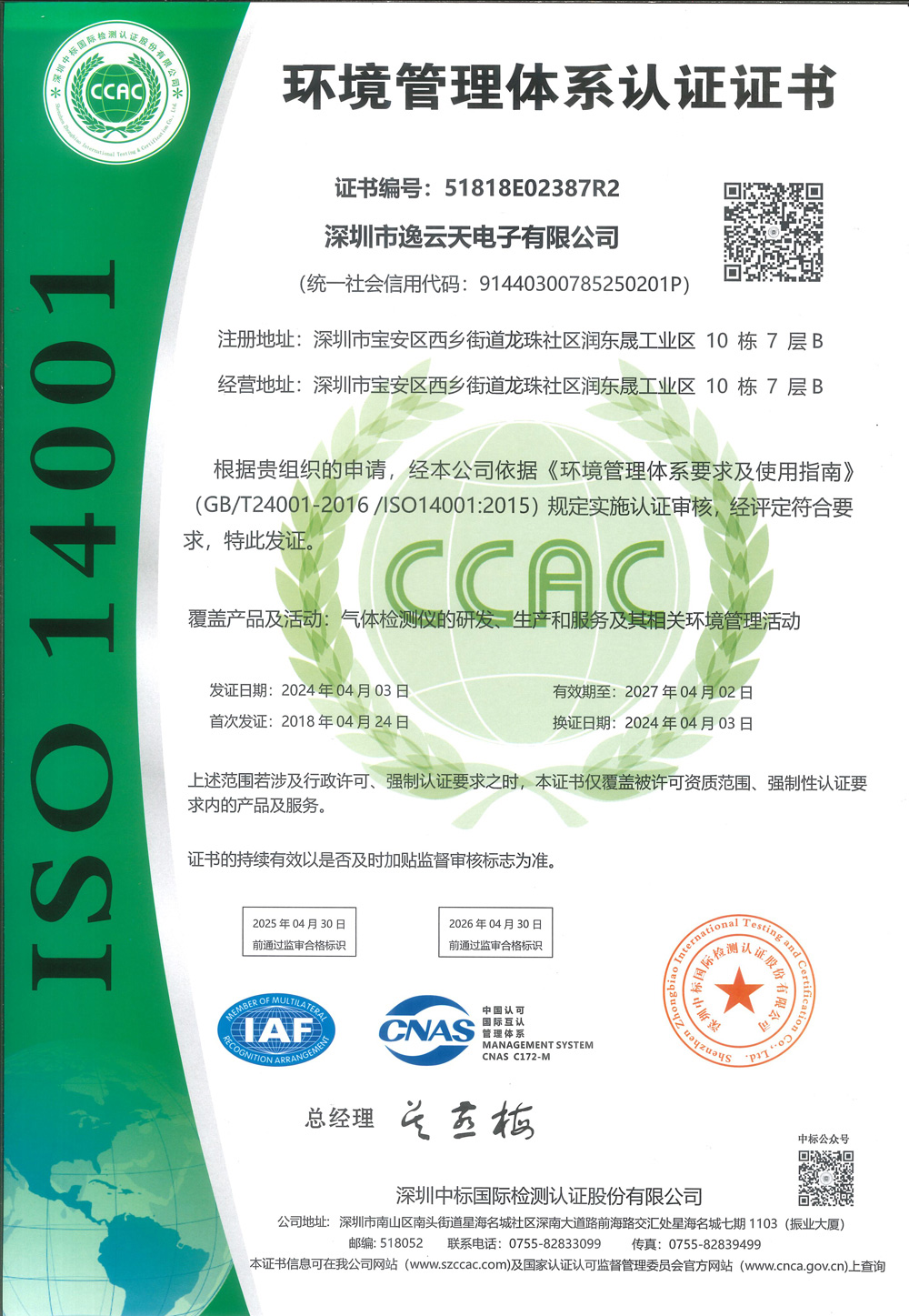 深圳市逸云天電子有限公司成立于2006年初,是集設計、研發、生產、銷售于一體的國家高新技術企業。可提供有毒有害、易燃易爆氣體檢測報警儀、氣體分析儀、氣體在線監測預處理系統、VOCs在線監測系統、微型空氣監測站、惡臭在線監測系統、差分紫外光譜氣體分析儀、激光氣體分析儀、環保安監氣體監測云平臺等產品。逸云天已通過ISO9001質量管理體系認證、IS014001環境管理體系認證、ISO45001職業健康安全管理體系認證、CCEP中國環保產品認證;并取得相應產品防爆合格證、CPA型式批準證書、消防產品認證證書、外觀專利證書、軟件著作權登記證書等。本公司產品已經在石油、化工、燃氣輸配、倉儲、市政燃氣、消防、環保、冶金、生化醫藥、能源電力等行業得到了廣泛的應用,并得到廣大客戶的一致認可。