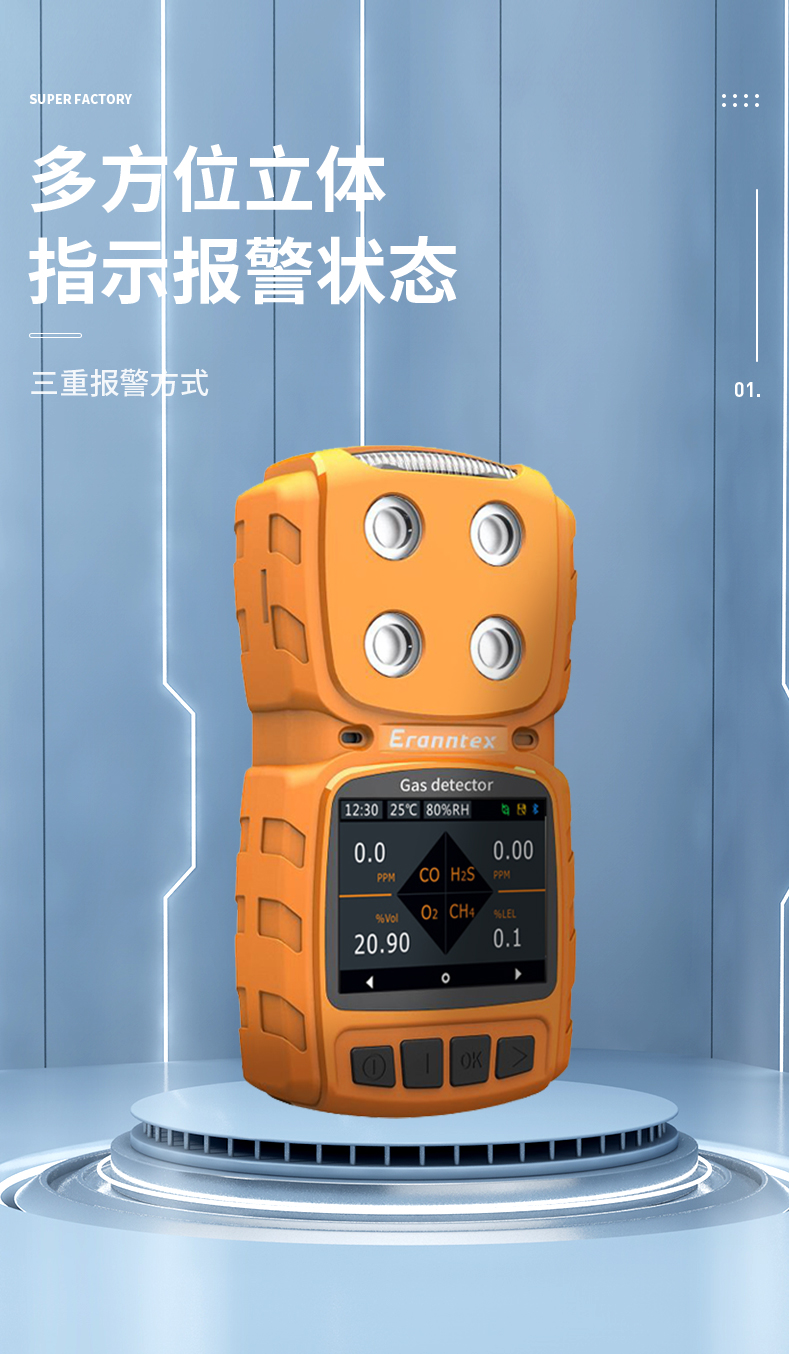 包含聲光報(bào)警、振動(dòng)報(bào)警、視覺(jué)報(bào)警。報(bào)警種類(lèi)包含:濃度報(bào)警、欠壓報(bào)警、故障報(bào)警。