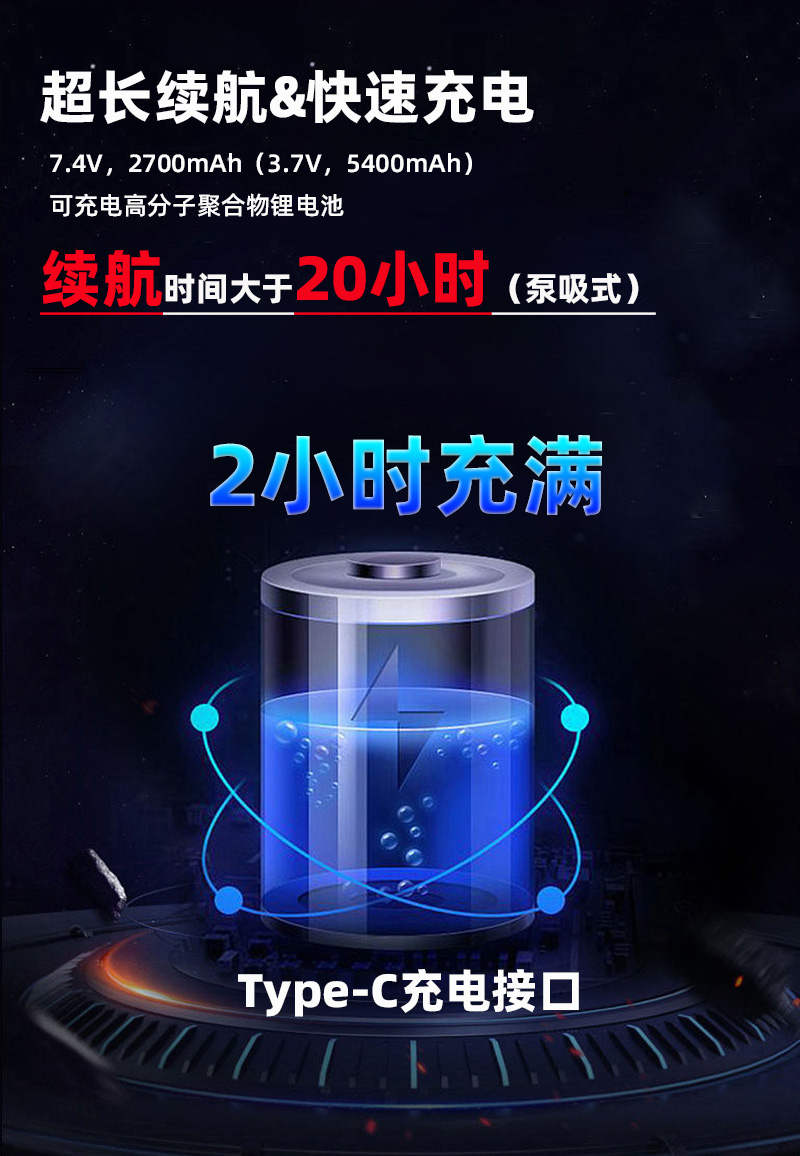 電池容量 | 7.4V,2700mAh(3.7V,5400mAh)可充電高分子聚合物鋰電池,續航時間大于20小時(泵吸式) |