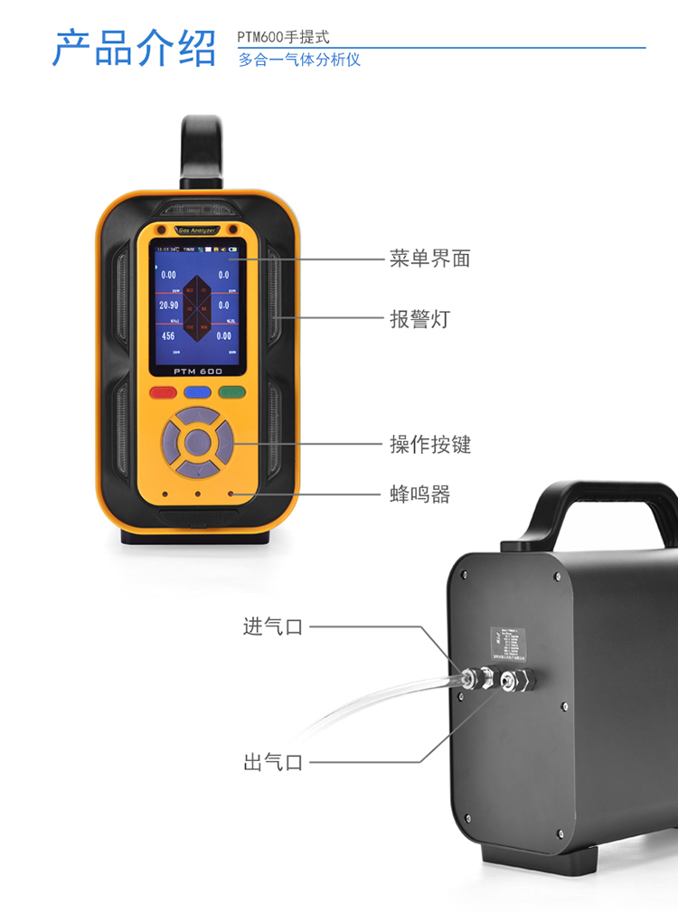 PTM600系列復合型氣體分析儀用于:精確檢測分析多種氣體濃度及環境溫濕度測量,PTM600采用3.5英寸高清彩屏實時顯示,采用進口著名品牌的氣體傳感器,主要檢測原理有:電化學、紅外、催化燃燒、熱導、PID光離子等。采用瑞士高精度電容式數字溫濕度傳感器。先進的電路設計、成熟的內核算法處理,獨特的外形設計,取得了多項軟件著作和外觀等專利。PTM600適用于檢測管道中或受限空間、大氣環境中的氣體濃度;氣體泄漏和各種背景氣體為氮氣或氧氣的高濃度單一氣體純度。檢測種類超過500余種。