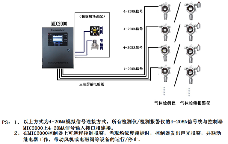 1 、氣體檢測儀/檢測報警儀與控制器連接示意圖(4-20MA信號)