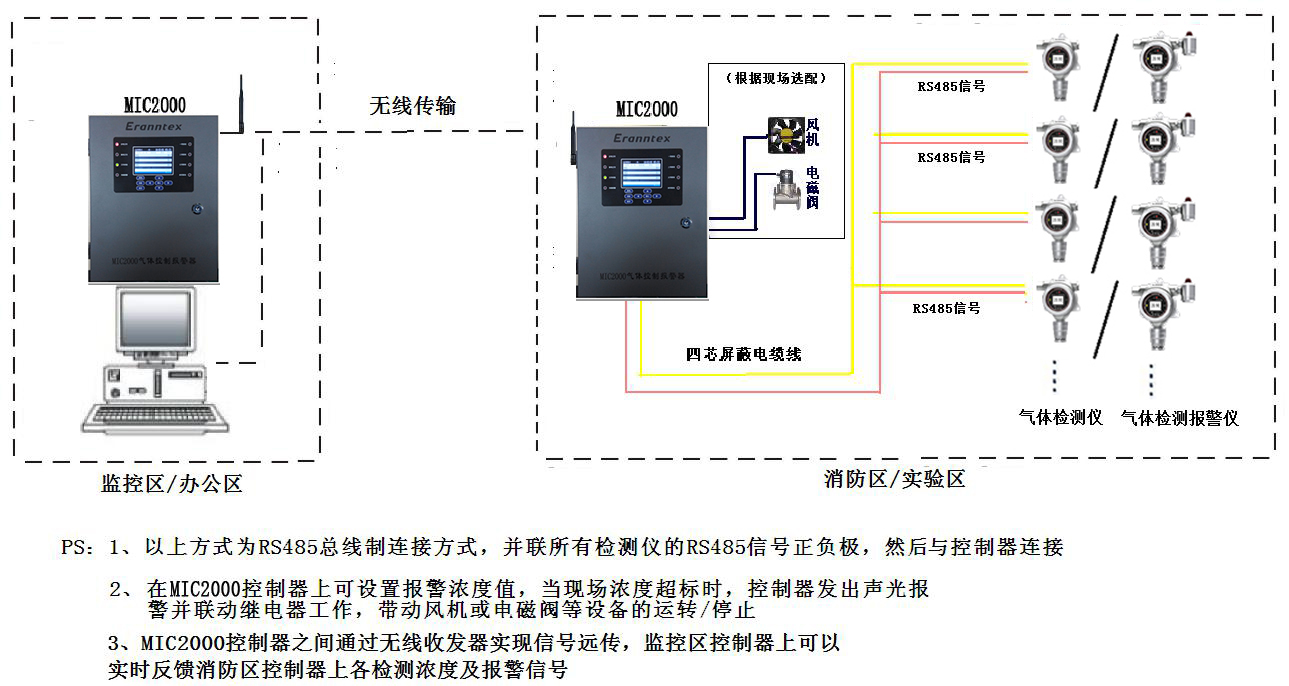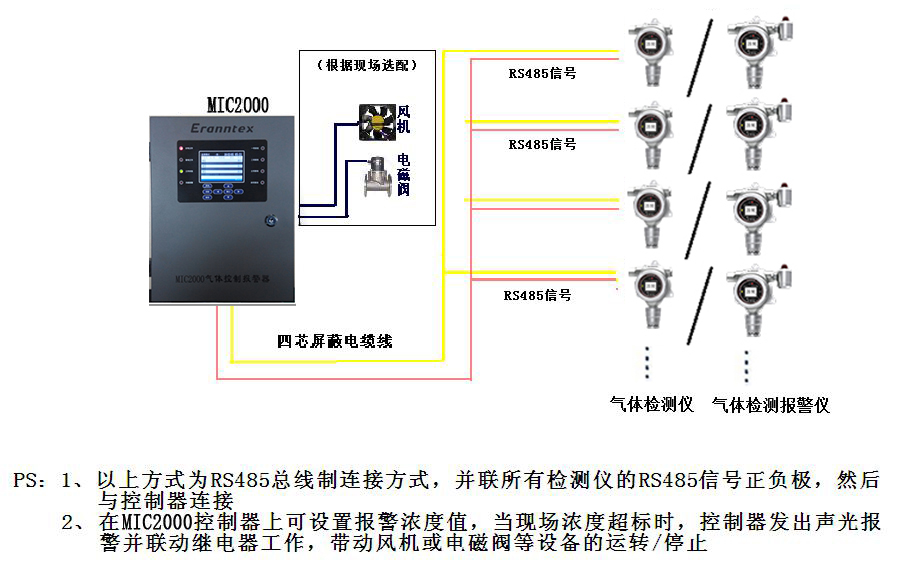 2 、氣體檢測儀/檢測報警儀與控制器連接示意圖(RS485信號)